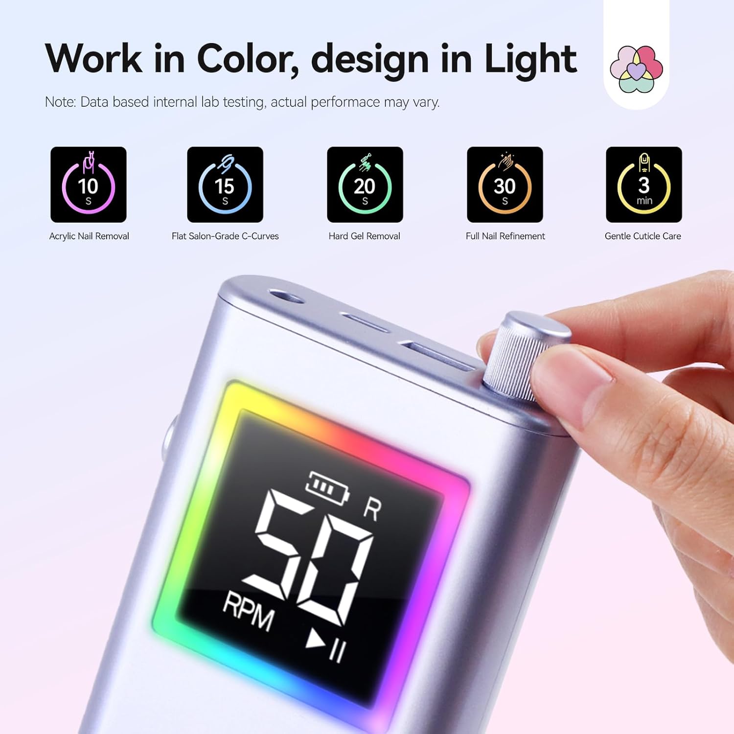 - Five-Color Rainbow Light: Each light color signifies a specific RPM range — purple (0-11000), blue (11001-20000), white (21001-30000), pink (31001-40000), and red (41001-50000), while the screen displays battery level, speed (RPM), forward/reverse rotation, and charging status