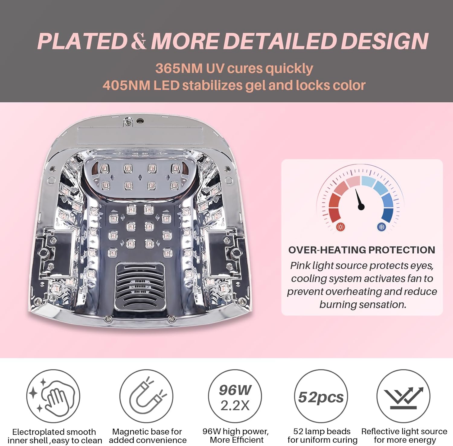 - DUAL LIGHT SOURCE & 52 BEADS - Using advanced UV LED double light source bulb technology to cure all kinds of nail gel; 52 Beads 96 watts of power offers 90% faster curing speeds than lower wattage UV nail lamp.
