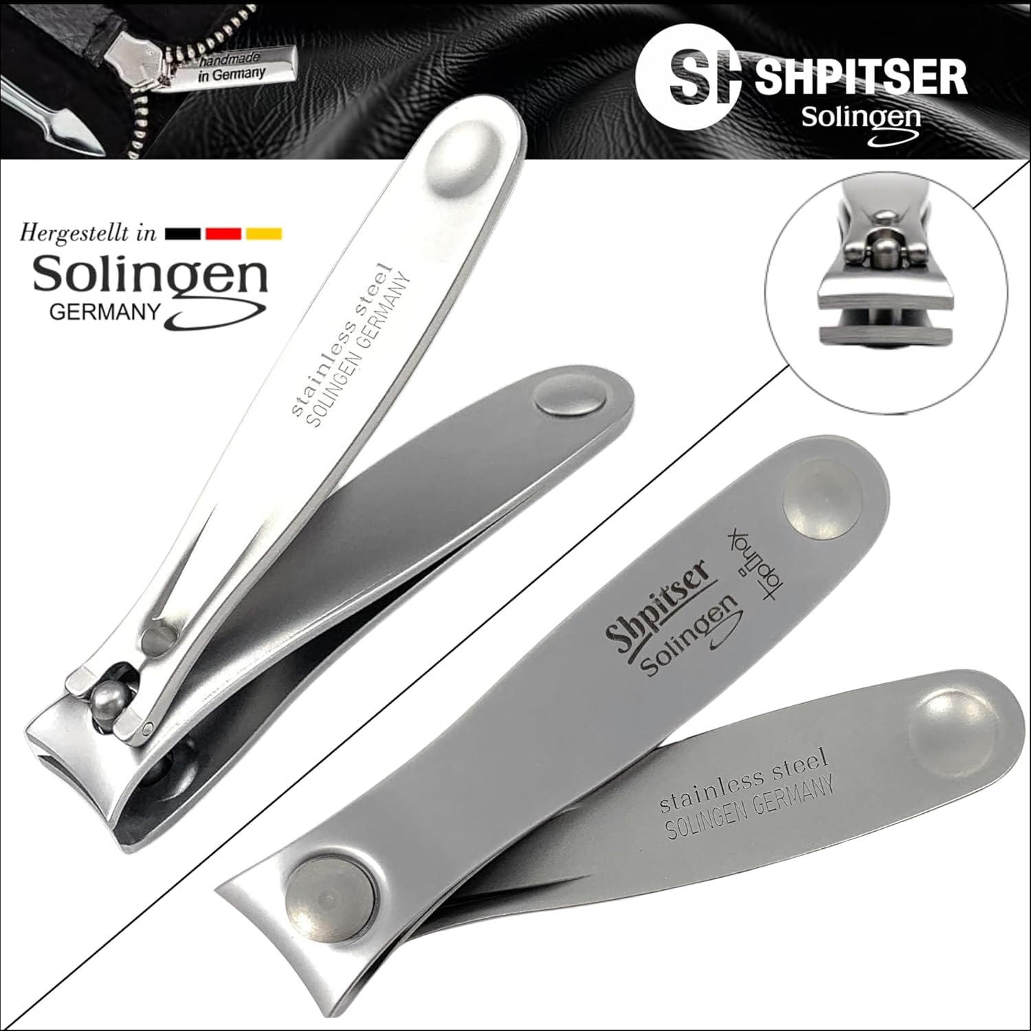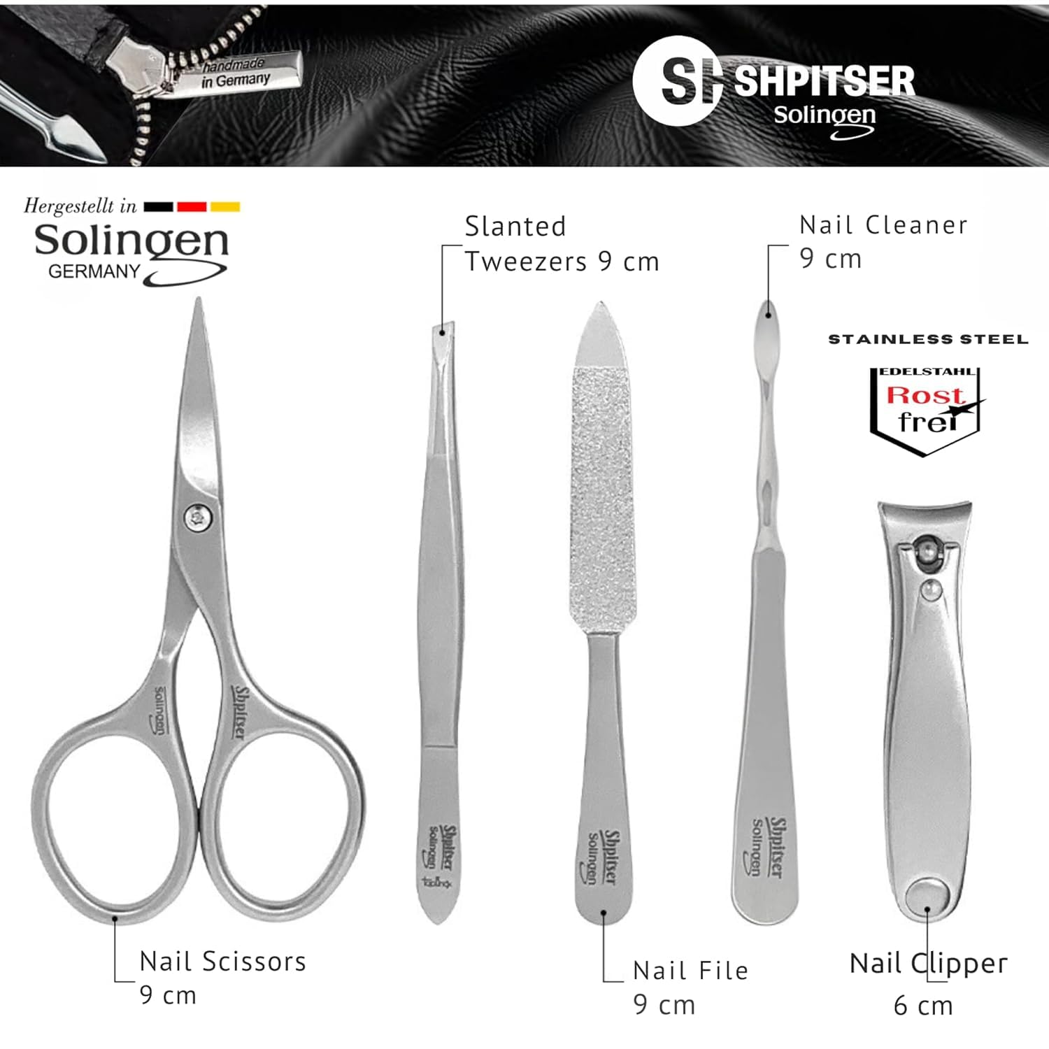Shpitser Nail Kit, Manicure and Pedicure Women Set of 5 tools: Scissors, Clipper, Tweezers, Nail Cleaner, Nail File, Made in Solingen, Germany, Sturdy Stainless Steel, In Italian Leather Case