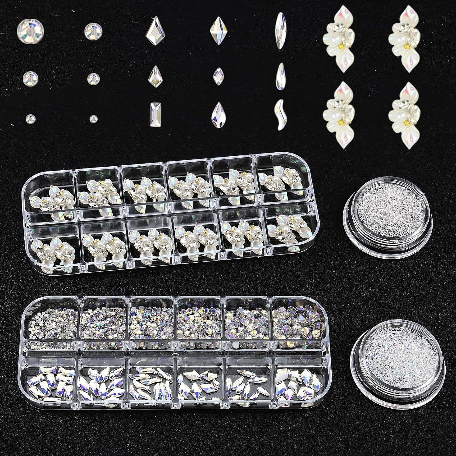 Rhinestones for Nails, Flatback Multi Shape Gems 3D Flowers Nail Charms Mixed Nail Glitter Powder Supplies Moonlight Crystal Jewelry Accessories for Women Manicure Decorations Design
