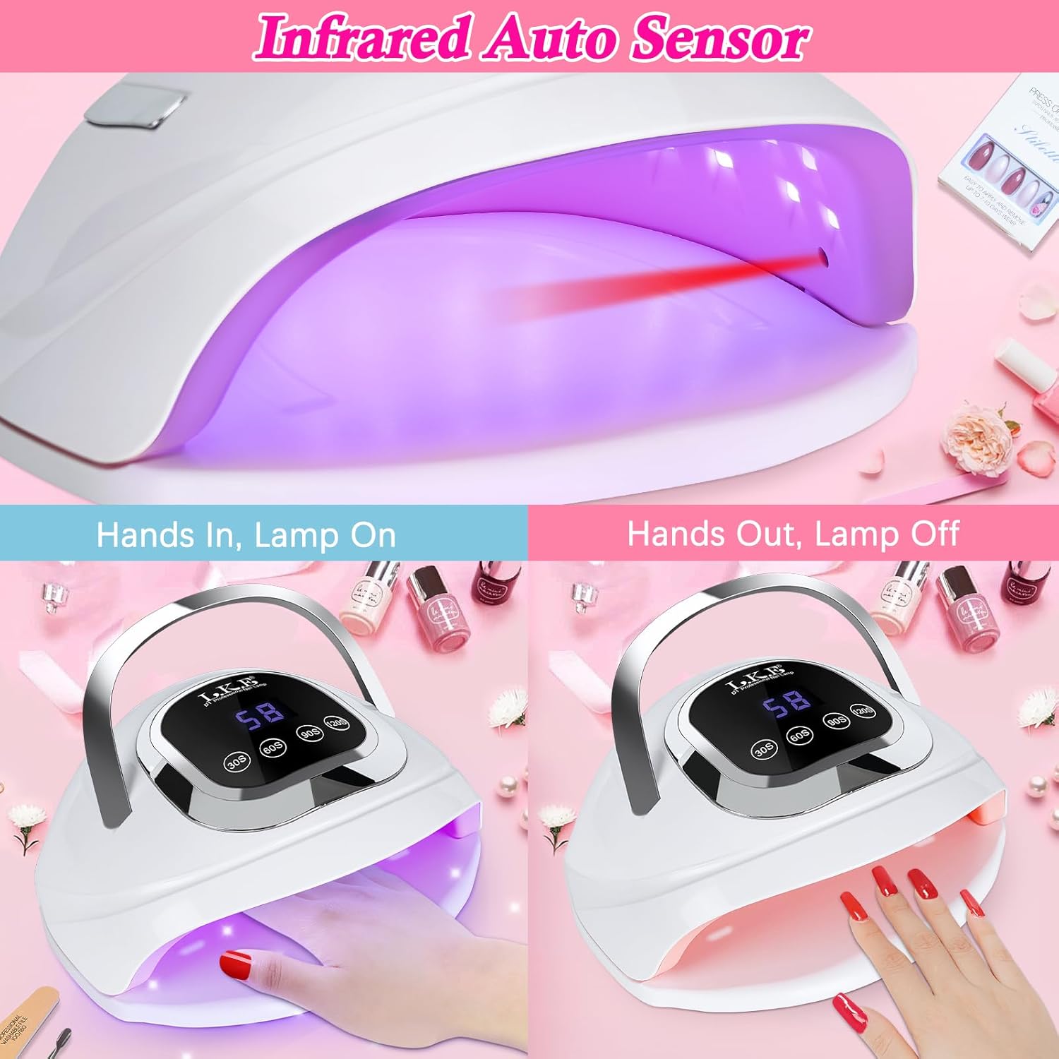 - [4 Timing Settings & Smart Sensor] There are 4 timers (30s, 60s, 90s, 120s) that can be selected according to the time you required for different gel polishes. Large LCD display shows curing time more clear. Our LED nail lamp is equipped with infrared auto-sensor for switching on/off without pressing any buttons.Hands/feet in, lamp on. Hands/feet out, lamp off.