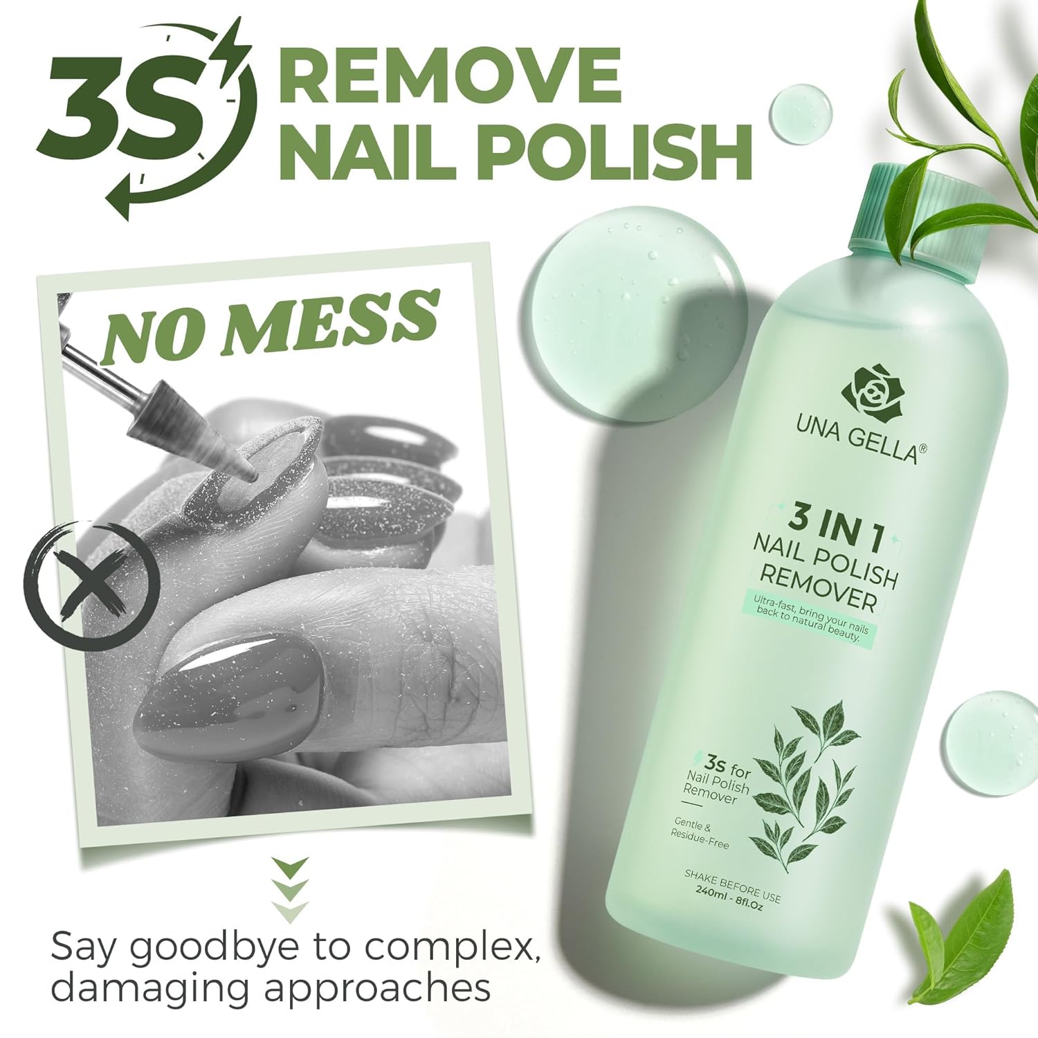 - Quick & Easy Nail Polish Removal: Say goodbye to complicated removal methods. UNA GELLA salon-grade fast-acting acetone nail polish remover erases nail polish with minimal effort - just 3-10 seconds for regular nail polish and 15 minutes for gel polish/nail glue. Warm tip: Fully buff the top coat layer of your nails to help the nail remover penetrate better for faster, more effective removal.
