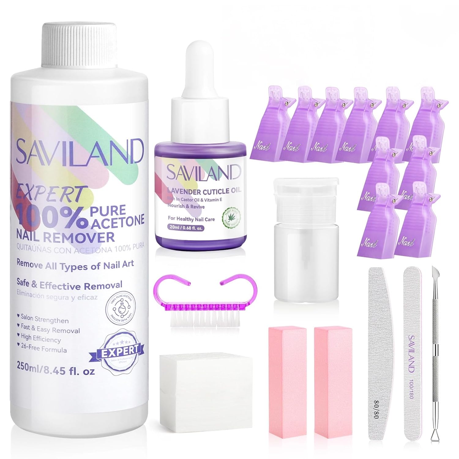 - Complete Gel Nail Polish Remover Kit: SAVILAND Nail Polish Remover Kit includes 250 ml Nail Polish Remover, 60ml Pump Bottle, 2 Nail Files, Nail Scraper, Cuticle Oil, 2 Nail Buffer Block, Handle Grip Nail Brush, 10 Nail Clips, and 200 Cleaning Pads for a complete removal experience
