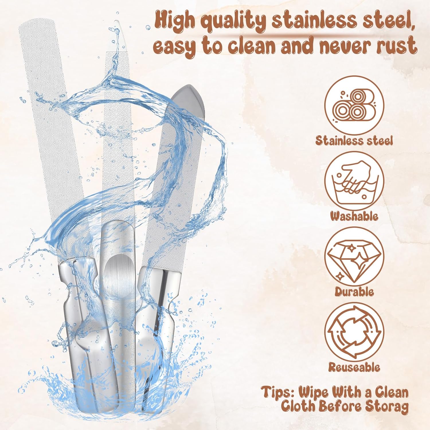 - 【Non slip Handle】The non-slip, contoured handle provides a secure grip for precise control during filing. Stainless steel files set's lightweight design reduces hand fatigue, while the tapered tip allows meticulous cleaning under nails. Available in three sizes (large: 12.5cm, medium: 11.6cm, small: 9.5cm), the stainless steel files set cater to varied hand sizes and detailed nail work