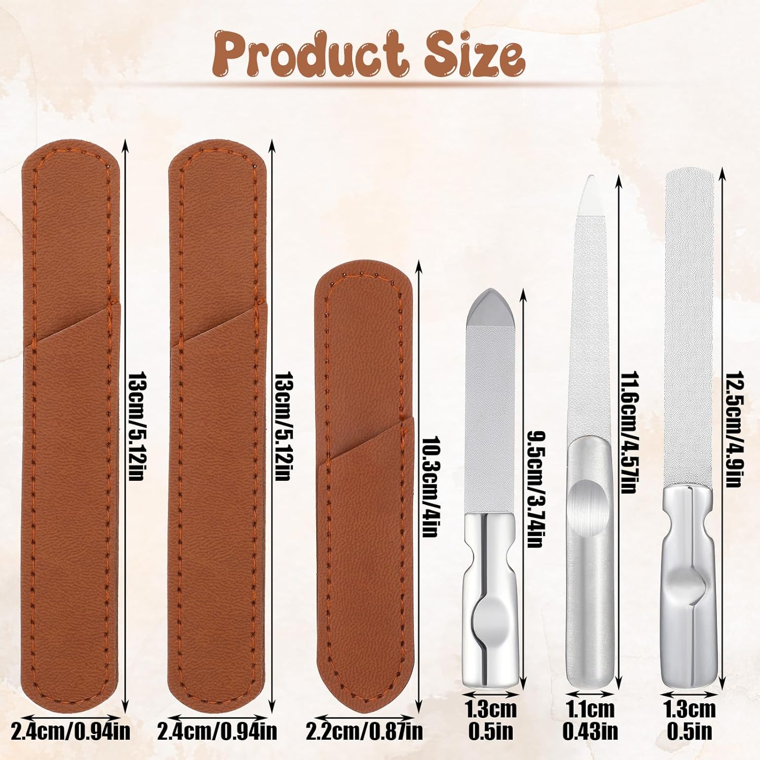 - 【Varied in dimensions】Our stainless steel nail file buffers contain 3 various sizes, nail files with pointed head are approx. 9.5*1.3cm/3.74*0.51 inches and approx. 11.6*1.1cm/4.57*0.43 inches respectively, the nail file with round head is approx. 12.5*1.3cm/4.9*0.5 inches, diverse dimensions can meet your diverse manicure purposes.Suitable for home use, salons, or travel, it’s a practical gift for nail enthusiasts seeking salon-quality results