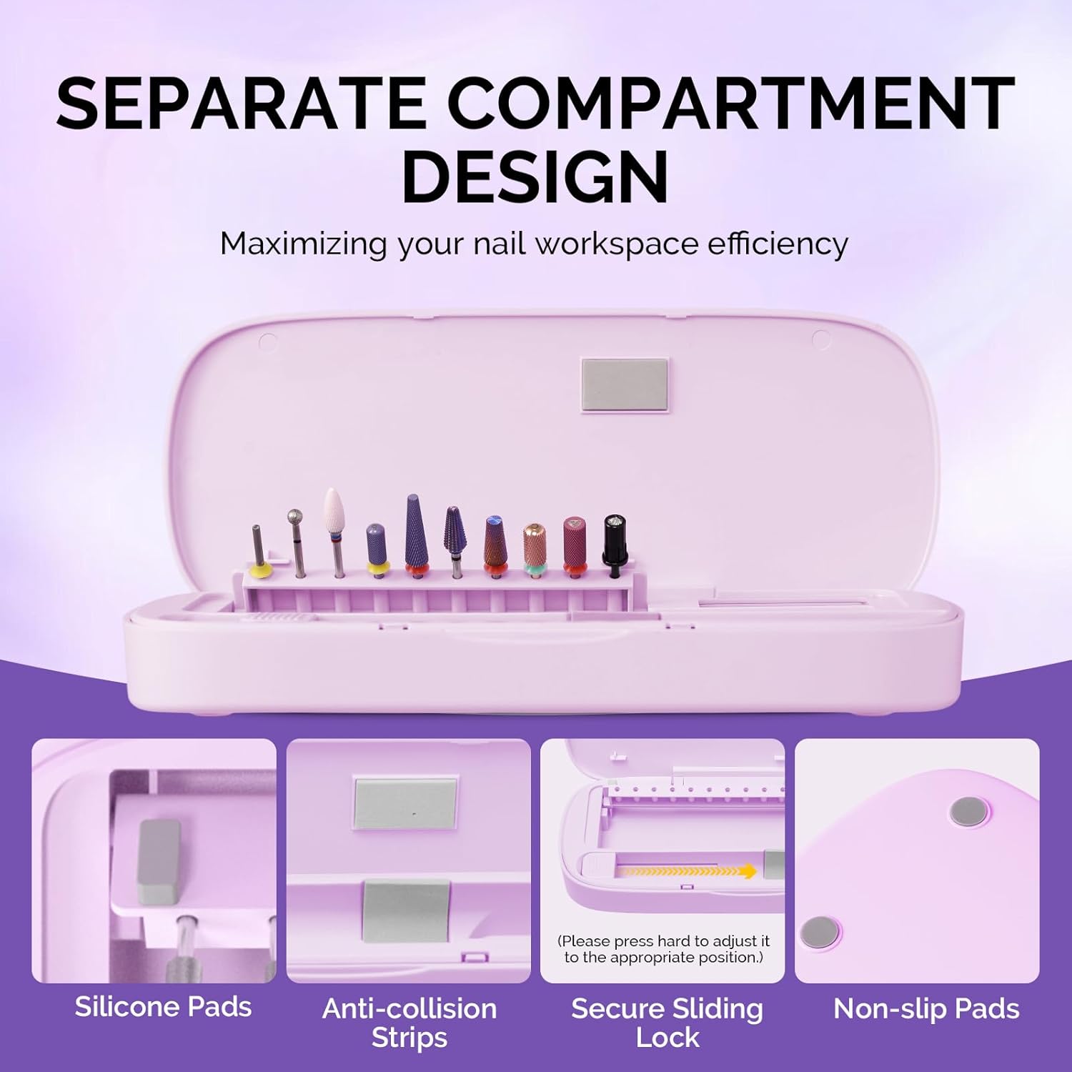 - [Separate Compartment Design]: Make nail accessories look tidy and orderly. It allows you to find the nail tools you need easily and quickly, improving efficiency to enjoy a better nail art experience. No mess on your nail art table and no mess on your travel bag. The fixed-position design prevents the nail drill bit from scratching other tools. Keep everything organized and stable, avoiding the damage caused by collision.