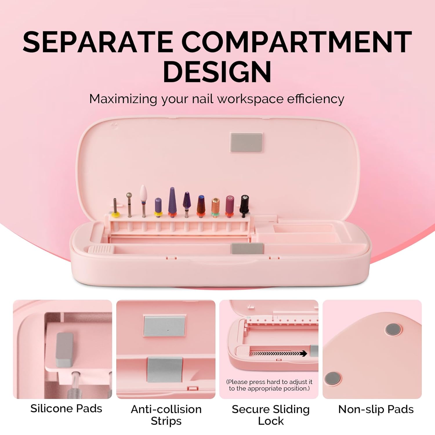 - [Separate Compartment Design]: Make nail accessories look tidy and orderly. It allows you to find the nail tools you need easily and quickly, improving efficiency to enjoy a better nail art experience. No mess on your nail art table and no mess on your travel bag. The fixed-position design prevents the nail drill bit from scratching other tools. Keep everything organized and stable, avoiding the damage caused by collision.