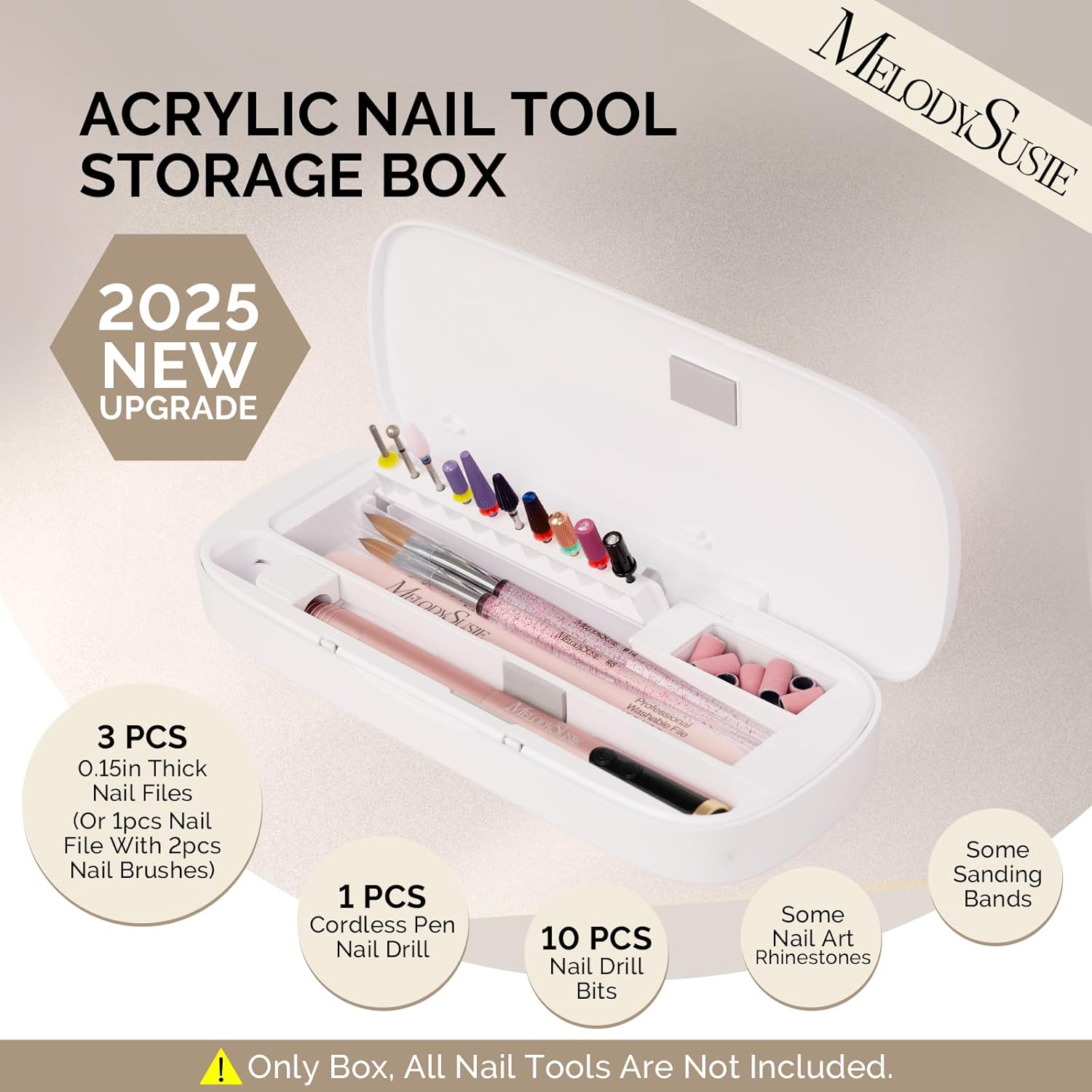 - [2025 New Upgrade Acrylic Nail Tool Storage Box]: It can hold 1 cordless pen nail drill, 10pcs 3/32'' nail drill bits, 3pcs 0.15in thick nail files(Or 1pcs nail file with 2pcs nail brushes), some sanding bands, some nail art rhinestones to meet your basic nail needs. The box inside is equipped with silicone pads and anti-collision strips, so the nail tools can be held stably no matter how you move the box. Four non-slip pads at the bottom, which are not easy to slide and can place the storage box firmly.