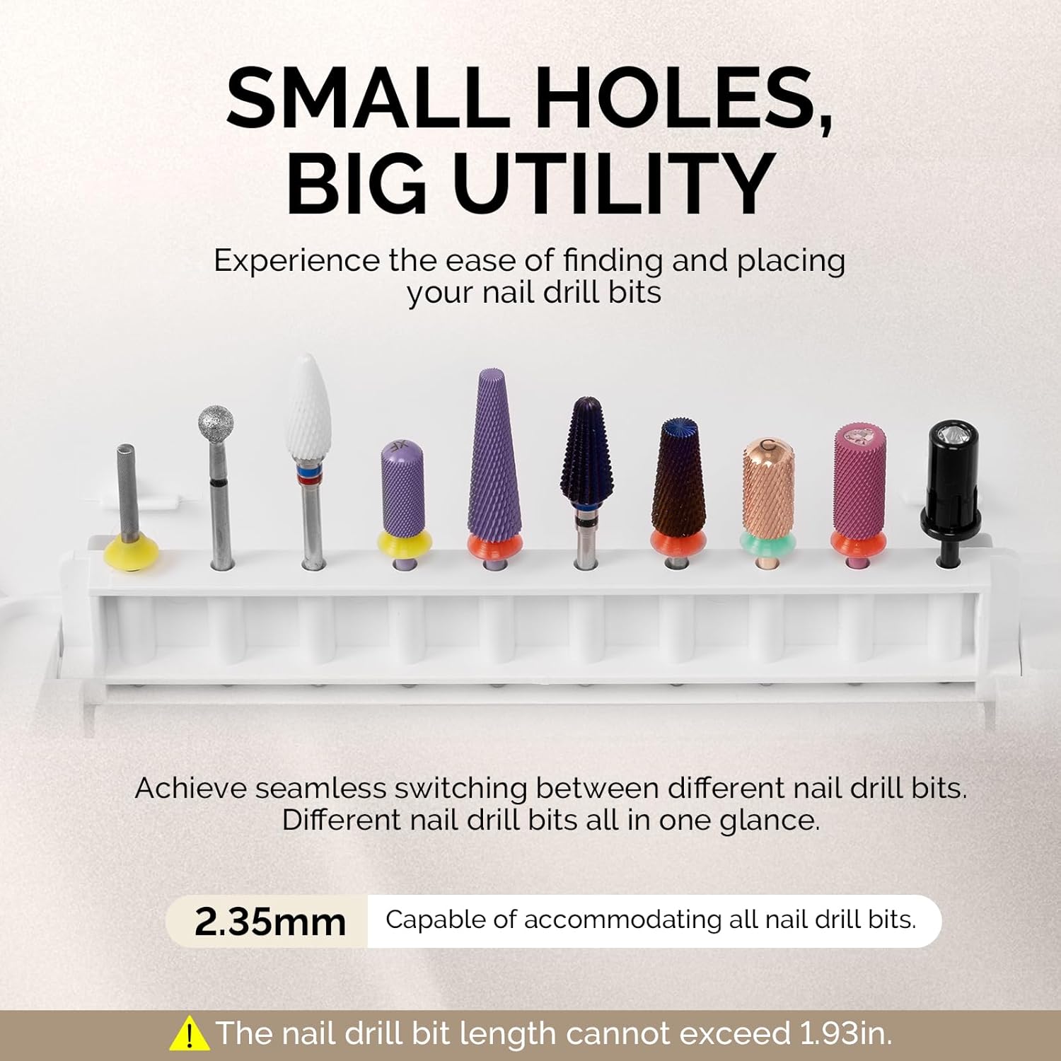 - [Separate Compartment Design]: Make nail accessories look tidy and orderly. It allows you to find the nail tools you need easily and quickly, improving efficiency to enjoy a better nail art experience. No mess on your nail art table and no mess on your travel bag. The fixed-position design prevents the nail drill bit from scratching other tools. Keep everything organized and stable, avoiding the damage caused by collision.