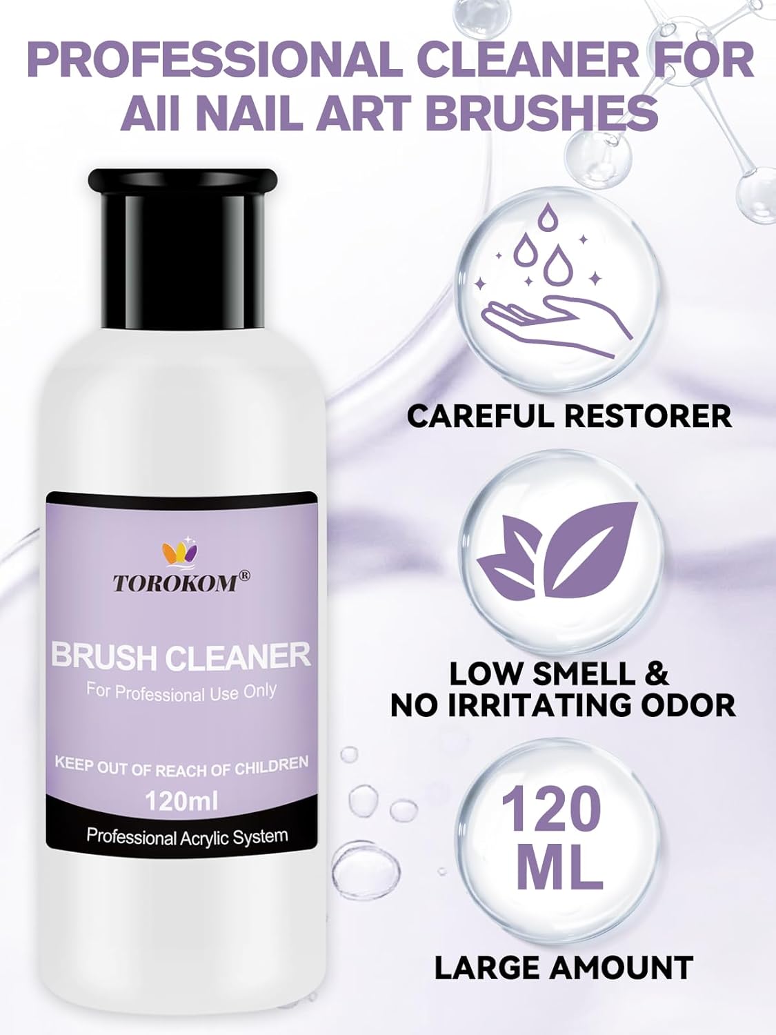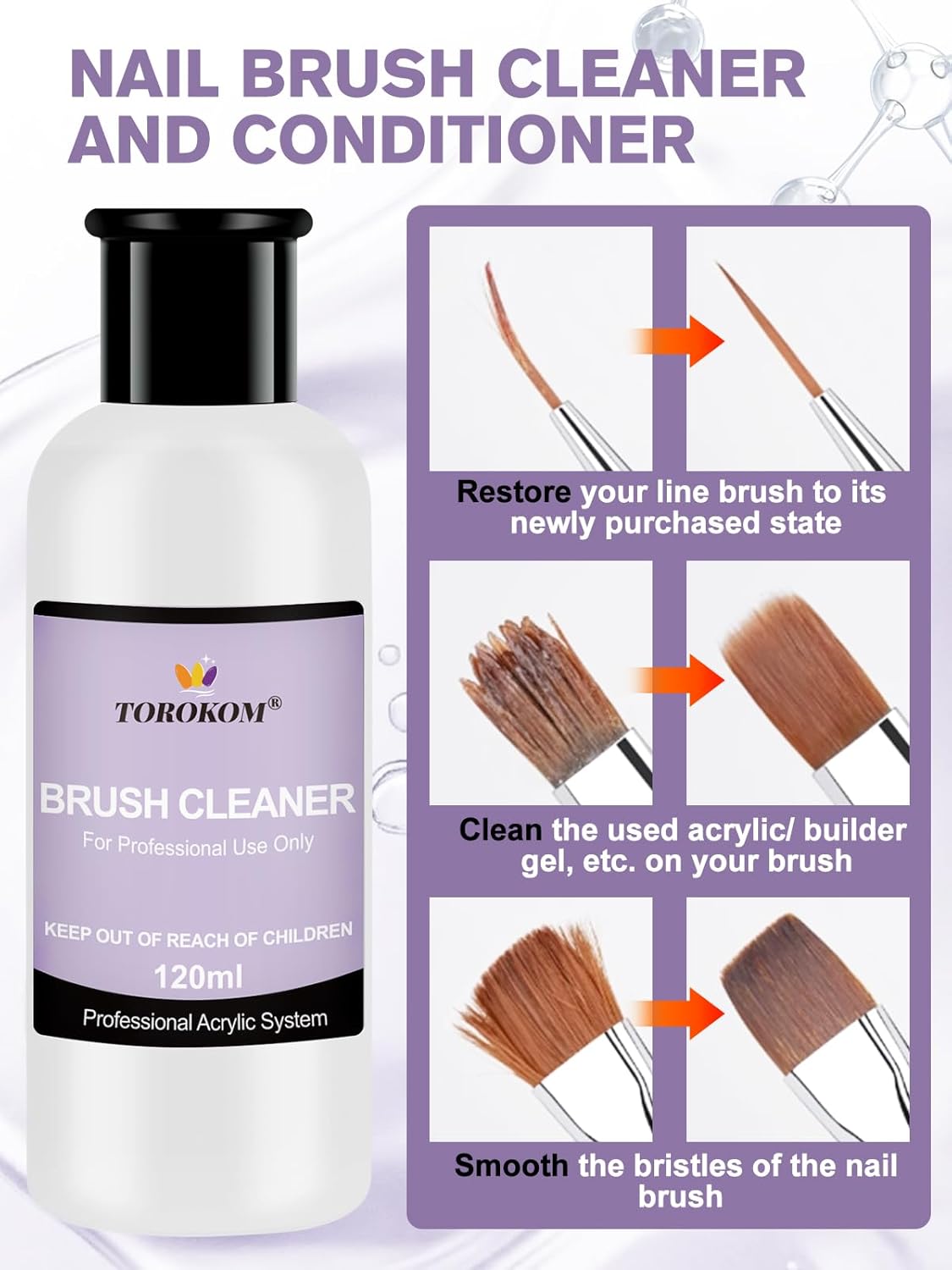 - Versatile Nail Brush Cleaner & Conditioner: TOROKOM acrylic nail brush cleaner features a high-performance formula to dissolve stubborn residue from acrylic, gel polish, and dip powder. Perfect for salon professionals and DIY nail artists seeking a brush cleaner acrylic nails that revives bristles effortlessly.