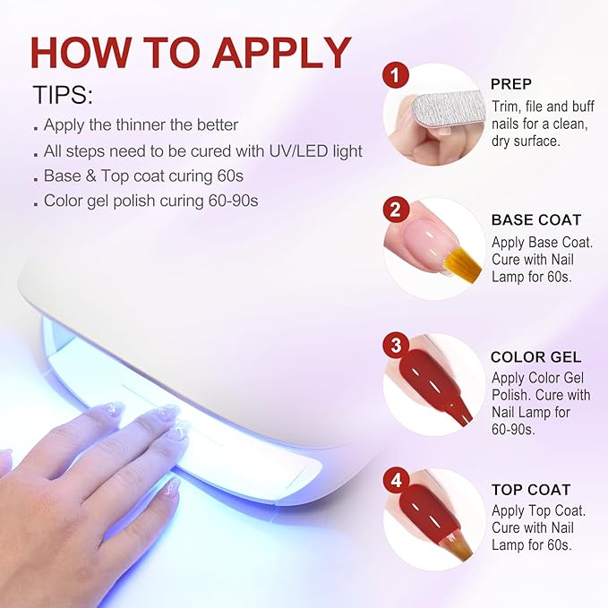 - Tips: Cure under UV or LED lamp for 90-120 secs; base and top coat required