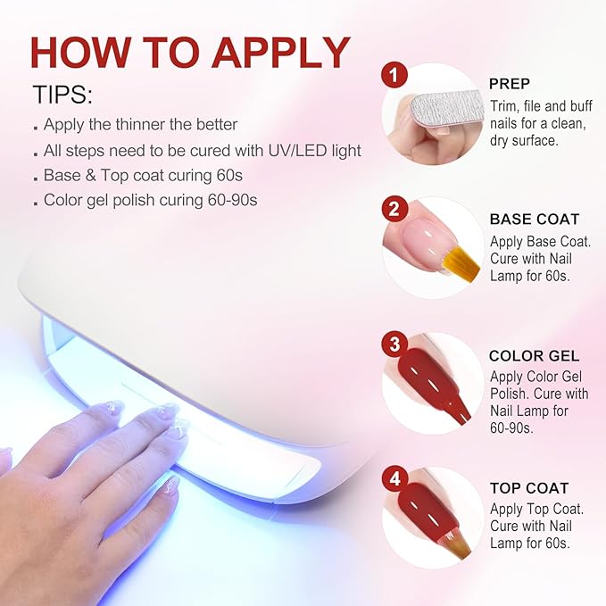 - Tips: Cure under UV or LED lamp for 90-120 secs; base and top coat required