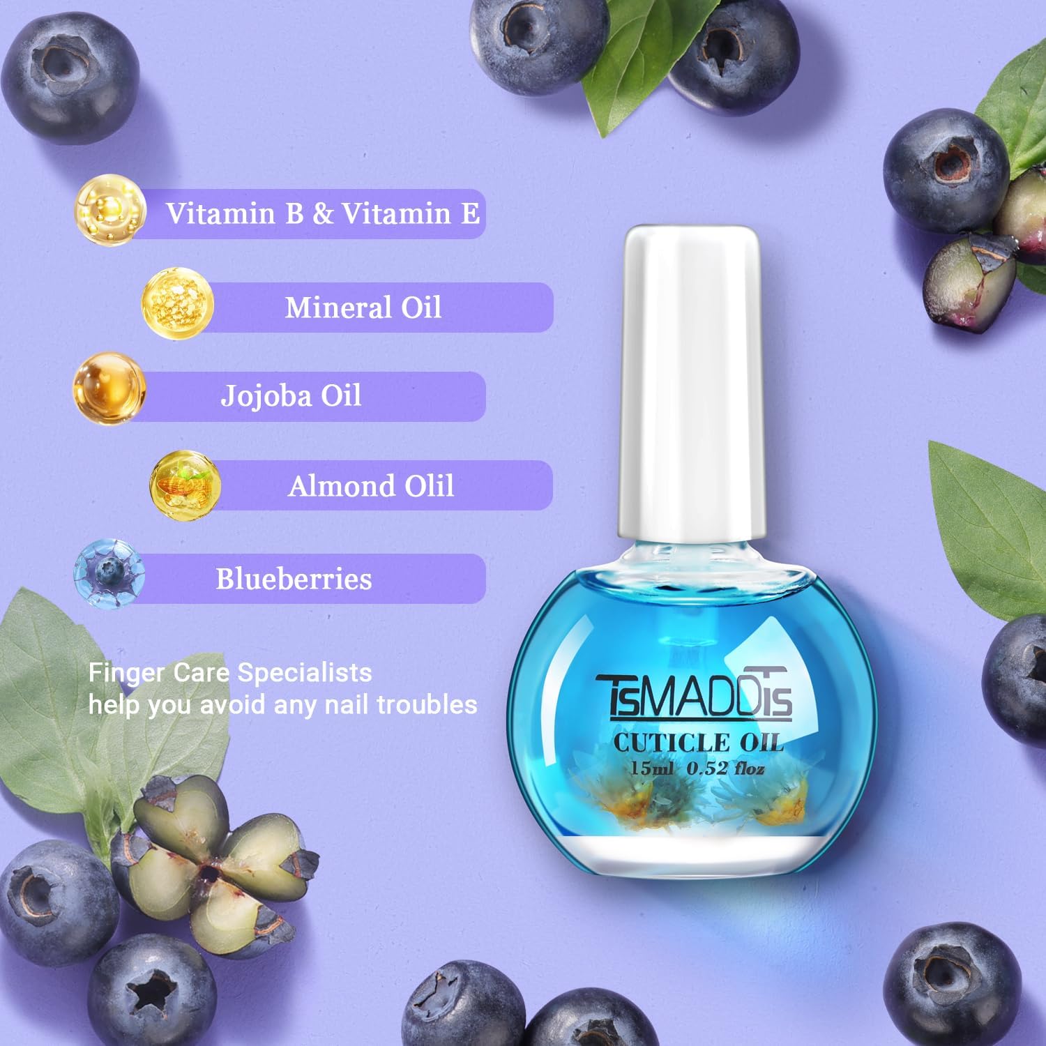- Nail Cuticle Oil: 15ml/bottle, includes 100% pure jojoba oil, natural vitamin b& vitamin e, natural blueberry oil extraction and sweet almond oil which can relieve nail oxidation. Natural extract to keep the stratum corneum moist. Absorbs quickly into nails and cuticles to deeply hydrate. Cuticle oil is enriched with a unique complex of natural vitamin and oil to effectively reduce epidermal wrinkles and nails and promote healthy nail growth