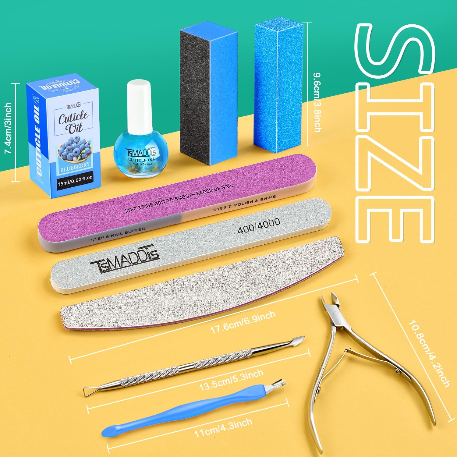 - Value Manicure Tools Kit: 2pcs 100/180 grit half moon nail files, 2pcs nail polishing buffer, 2pcs rectangular nail buffer block,1pcs 7-Way Nail File and Buffer Block, 1pcs cuticle nipper, 1pcs cuticle pusher, 1pcs cuticle fork and 1pcs 15ml/0.52oz blueberry nail cuticle oil. Professional manicure tools kit to DIY yourself freely as like at salon, save money and time from nail's shop. Make your daily nail care easy and convenient at home