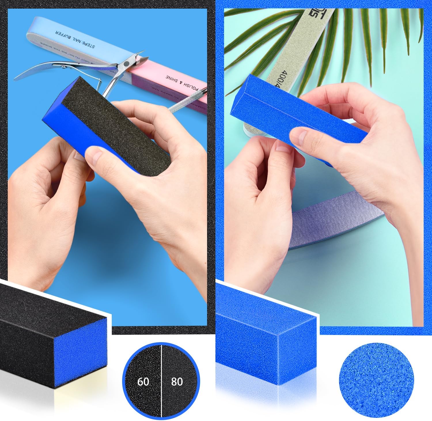 - Nail Files & Nail Polishing Buffers: Double sided half mooon nails, made of premium adhesive tape and emery board materials, can file and rough up the hard fingernails and toe nails in 100 grit, and use 180 grit smooths up your nail edge with refined shape. Nail Polishing Buffer: 2 different grit side: 400 grit green side can refine nail surface and 4000 grit white side helps to smooth nail surface