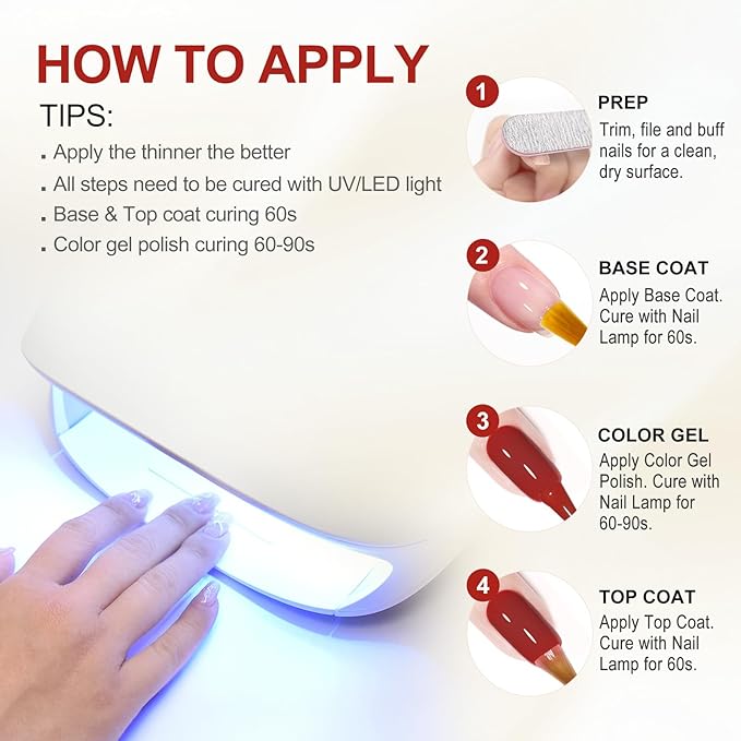 - Tips: Cure under UV or LED lamp for 90-120 secs; base and top coat required