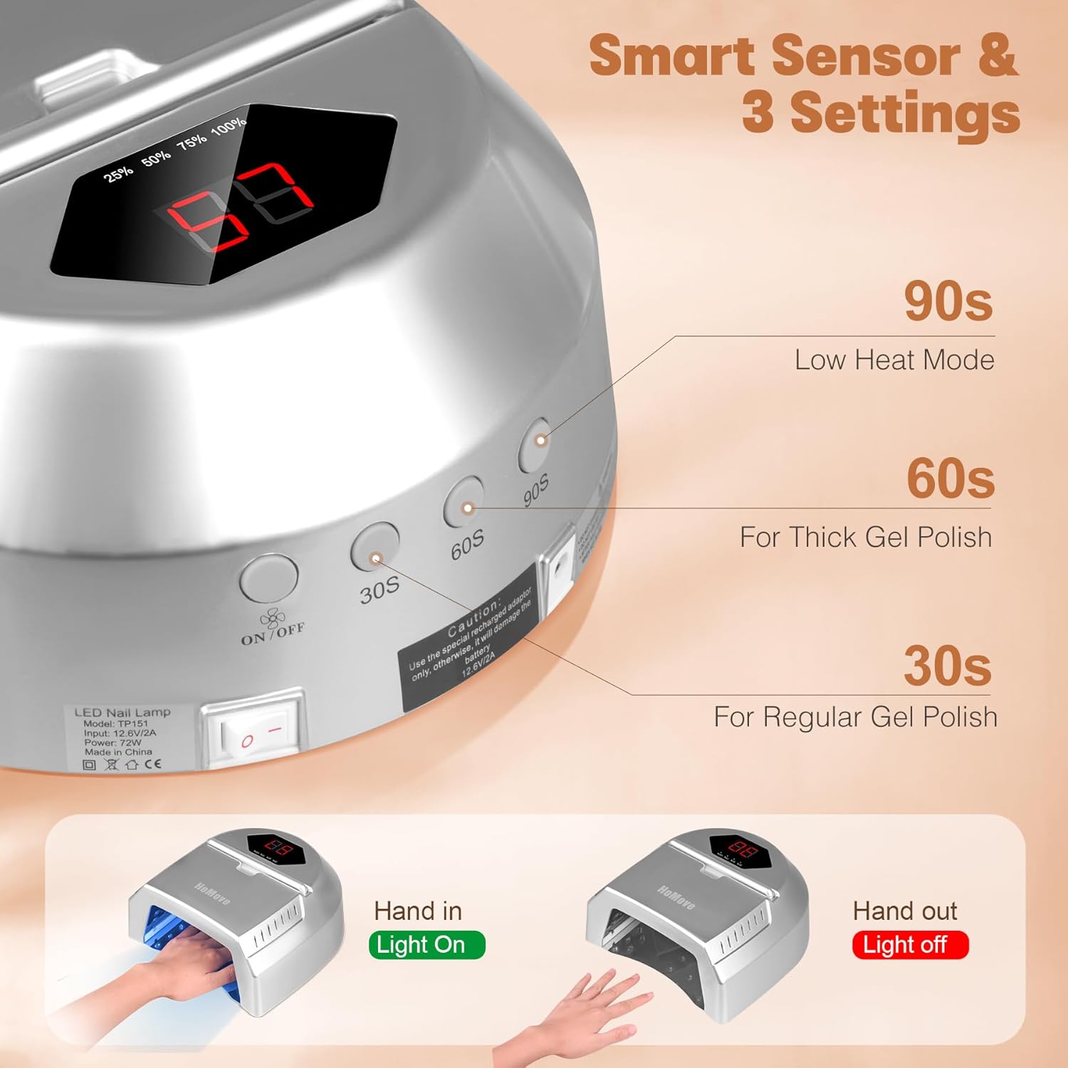 - 【72W High Power & 2X Faster Curing】HoMove 72w powerful UV nail lamp with 45 high-intensity UV LED light beads adopts advanced dual light sources technology ensures efficient and thorough curing of gel polish in half the time. Save curing time and enhance the nail art experience for you and your customers.