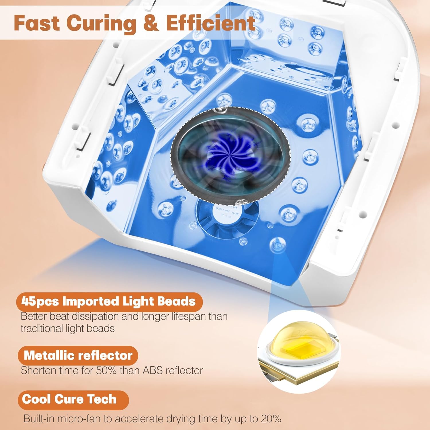 - 【Dual Care for Nails and Skin】 Compared to the traditional purple UV Light, our UV-LED nail lamp emits soft and closer uv light (365nm+400nm), which won't harm your eyes and no darkening skin. Our led nail lamp also comes with a cooling fan, it can relieve burning sensation and bring your customers a comfortable salon-like manicure experience.