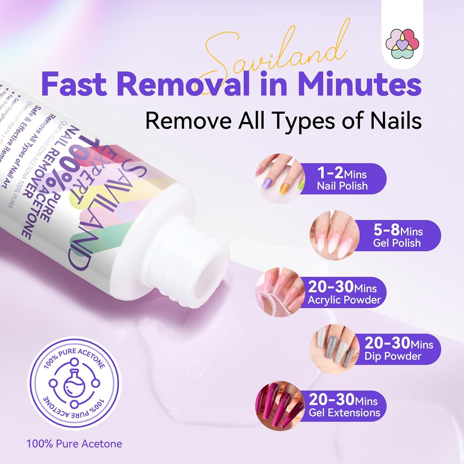 - For All Types of Nail Art Removal: SAVILAND Gel Nail Remover can remove all types of nail art, including nail polish, gel nail polish, nail glue, acrylic nails, and builder nails, etc