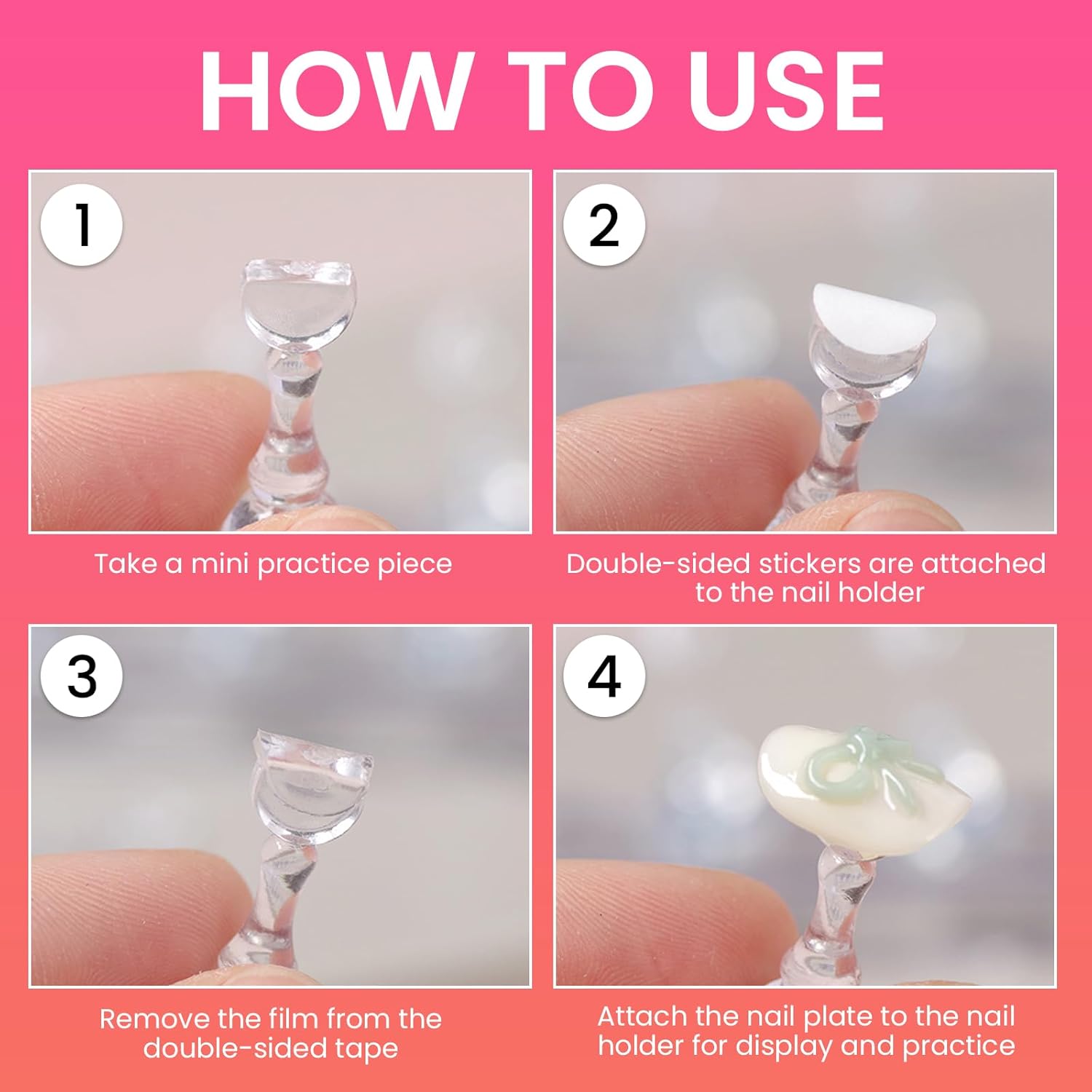 - Product Specification: The set includes two wooden magnetic nail practice stand (each with a base and five nail tip holders) that can be used as display racks, a heart-shaped acrylic gel nail polish holder for more complex nail designs (the acrylic base has a protective film that you can peel off) , and 200 pieces of double-sided tape. These are enough for you to practice using