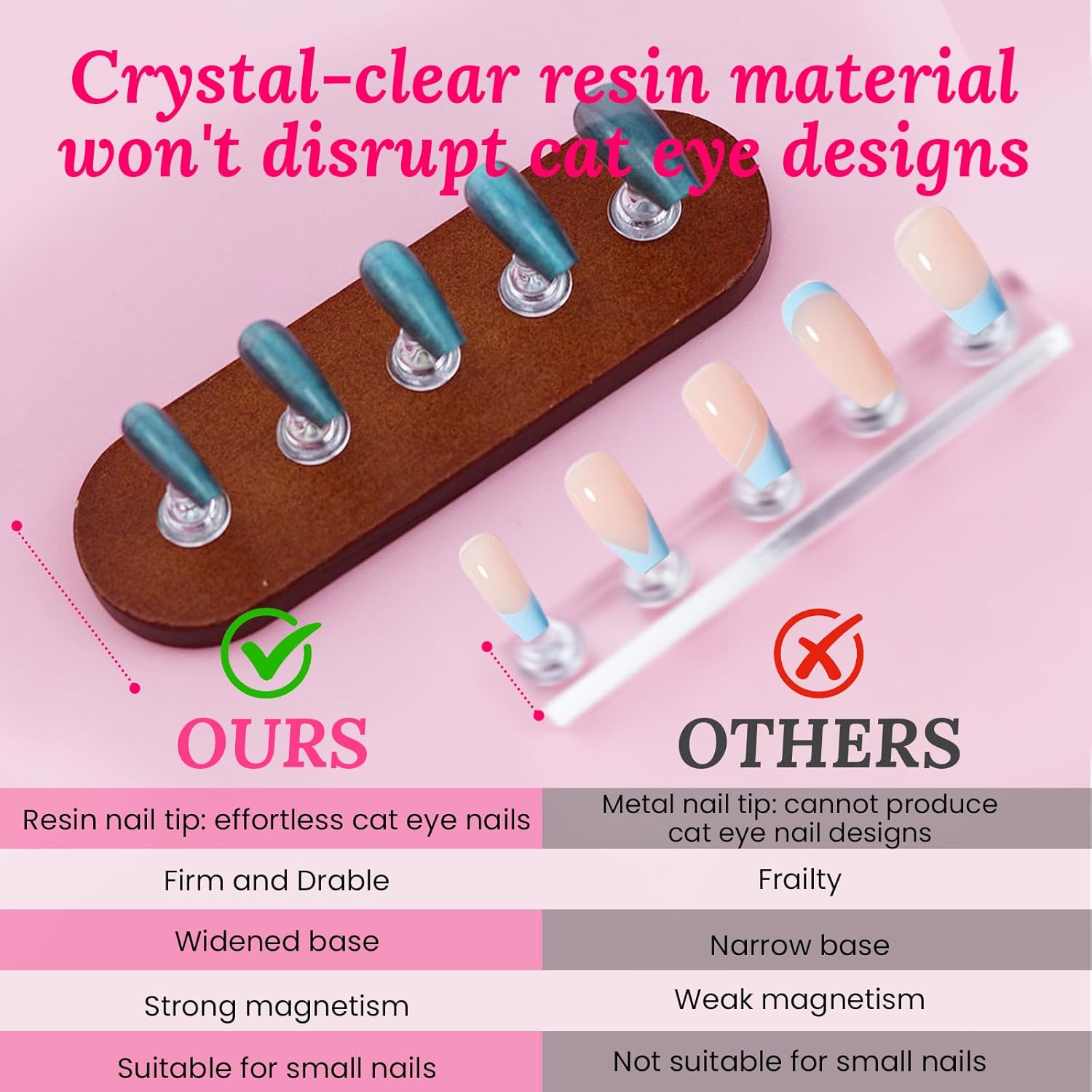 - Strong Magnetism: The wide base of the fake nail stand is not easy to upend. The strong adsorption effect allows the nail tip stand to easily attach to the iron sheet at the top of the wooden base. The Double-sided Tape ensures that your nail tip holder and nail stick together firmly. This allows you to focus on the nail design without worrying about the risk of shaking or the nail plate falling off the finger deck