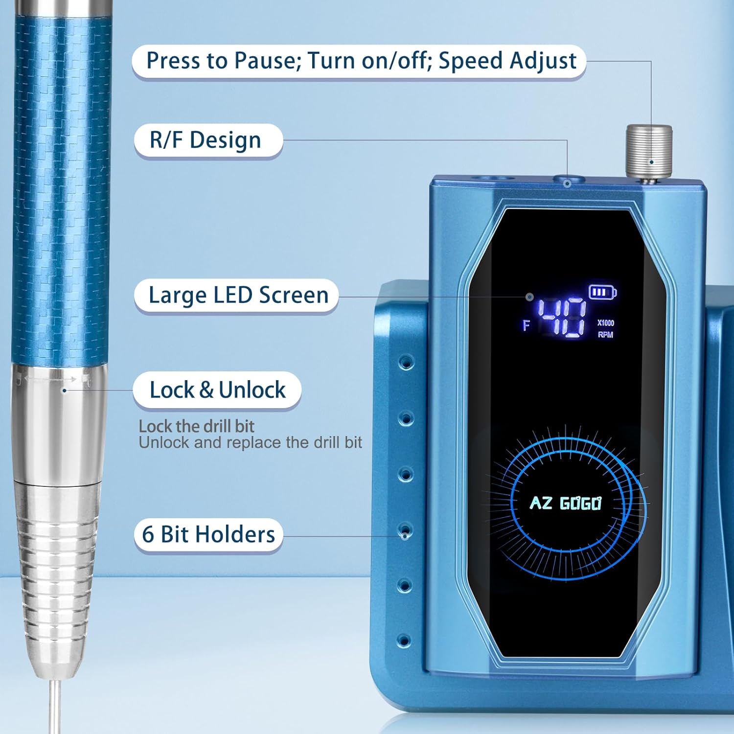 Professional Brushless Nail Drill, AZ GOGO 85W Cordless Electric Nail File 40000RPM Rechargeable Portable Nail Drill Machine for Gel/Acrylic Nails Salon Level (Blue)