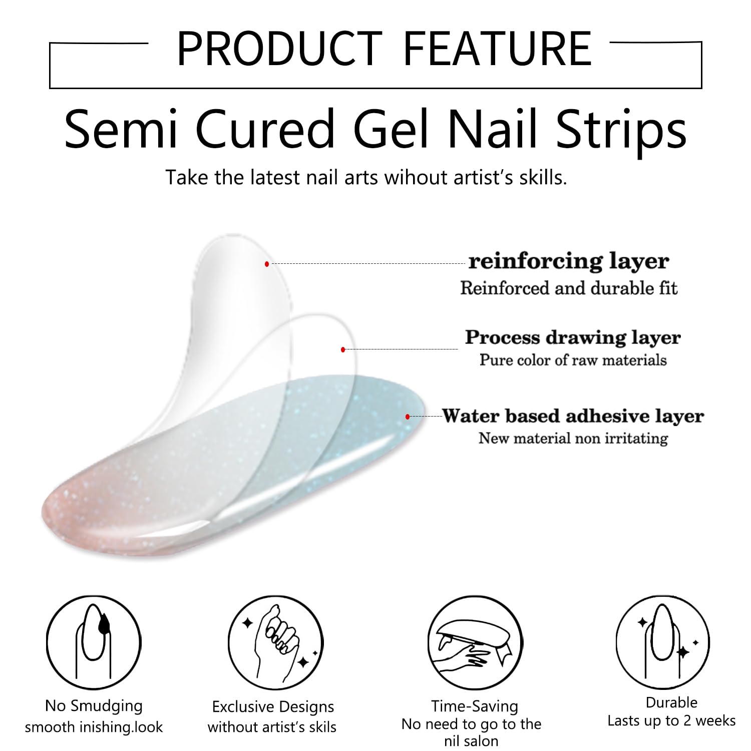 - NAIL-PRESERVING BEAUTY - Our UV-cured gel nail stickers safeguard your nails, as they necessitate no nail surface buffing and are effortlessly removable. With our nail strips, your natural nails remain healthy, enabling frequent style shifts without compromise.