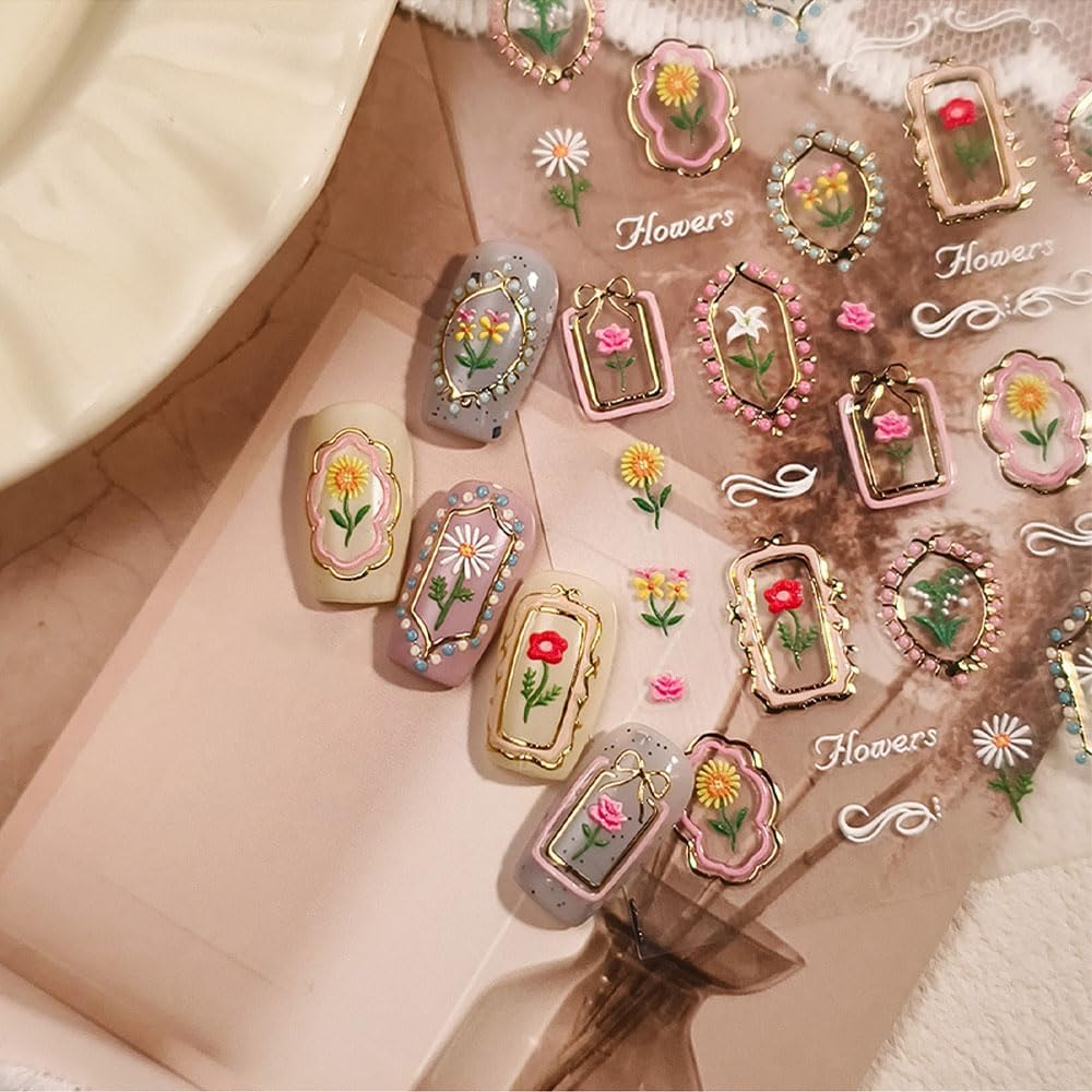 - PREMIUM DESIGN: 5D embossed nail art stickers featuring delicate floral patterns with golden frames and rhinestone-style accents for an elegant manicure