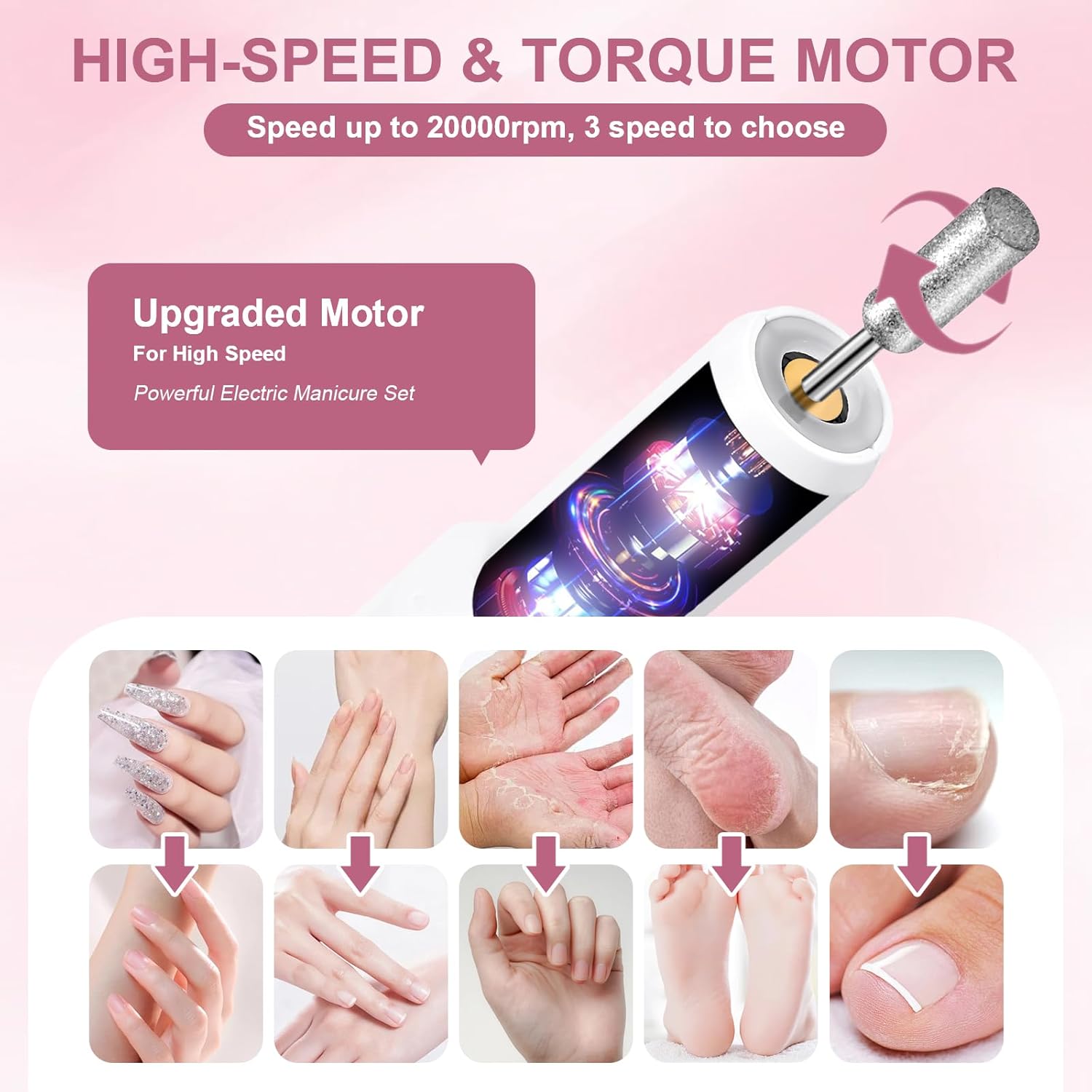 - User-Friendly, Ideal for Beginners: This electric nail filer is equipped with 3 adjustable speeds (0-20,000rpm) and allows for both forward and reverse rotation. It's designed with an ergonomic body for comfortable handling and straightforward speed and direction controls. Achieve salon-quality manicures and pedicures effortlessly, even if you're new to using an efile nail drill!