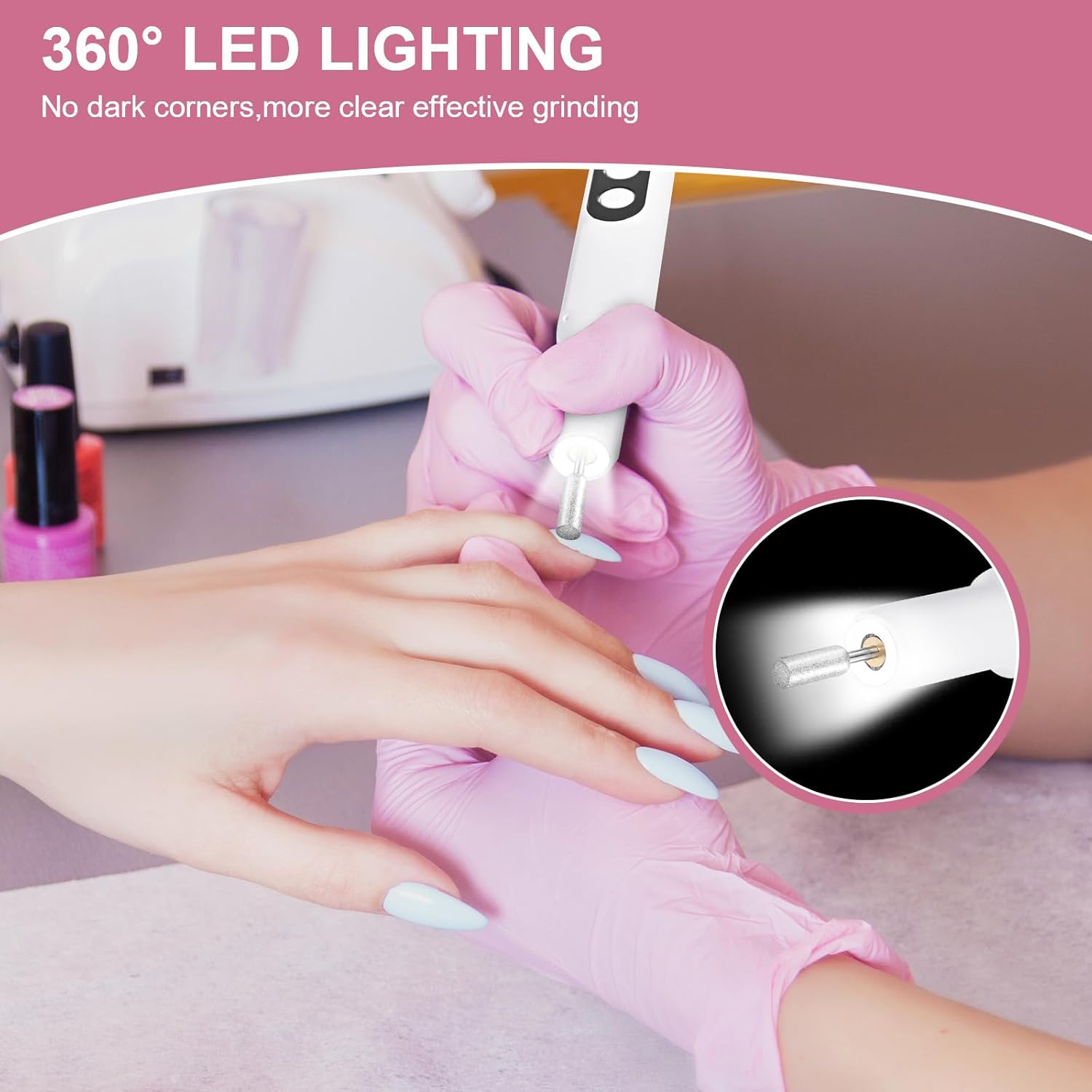 - Cordless & Portable & 360° LED Light: Our Cordless nail drill eliminate the hassle of cords and cumbersome devices! The electric nail drill stand out for its lightweight and portable design, making it a perfect companion on the go. Equipped with a 360° LED light, this device ensures a well-lit and perfectly illuminated workspace, boosting the efficiency and quality of your manicure and pedicure tasks, be it at home or traveling. Experience a salon-like treatment for your hands and feet anytime, anywhere you choose!