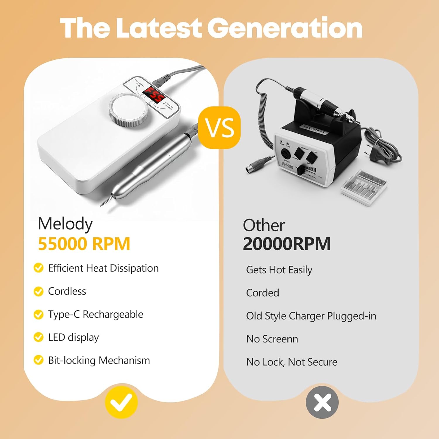 - 【MAX 55000 RPM High Speed】 Dial in up to 55000 RPM with the easy turn speed knob and HD LCD on our electric nail drill, delivering pro-level precision and smooth filing on acrylics, gels, poly gels, and artificial nails. Every swipe feels like salon magic!