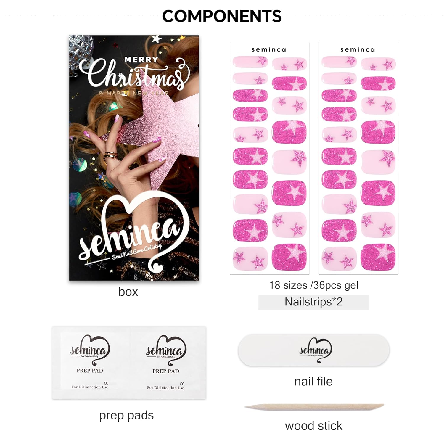 Semi Cured Gel Nail Strips-Magenta Shimmer Press on Nails with Pink Snowflakes & Stars Festive Winter Manicure Set Salon-Quality, Long Lasting, Easy On & Off(Pink Starlet)