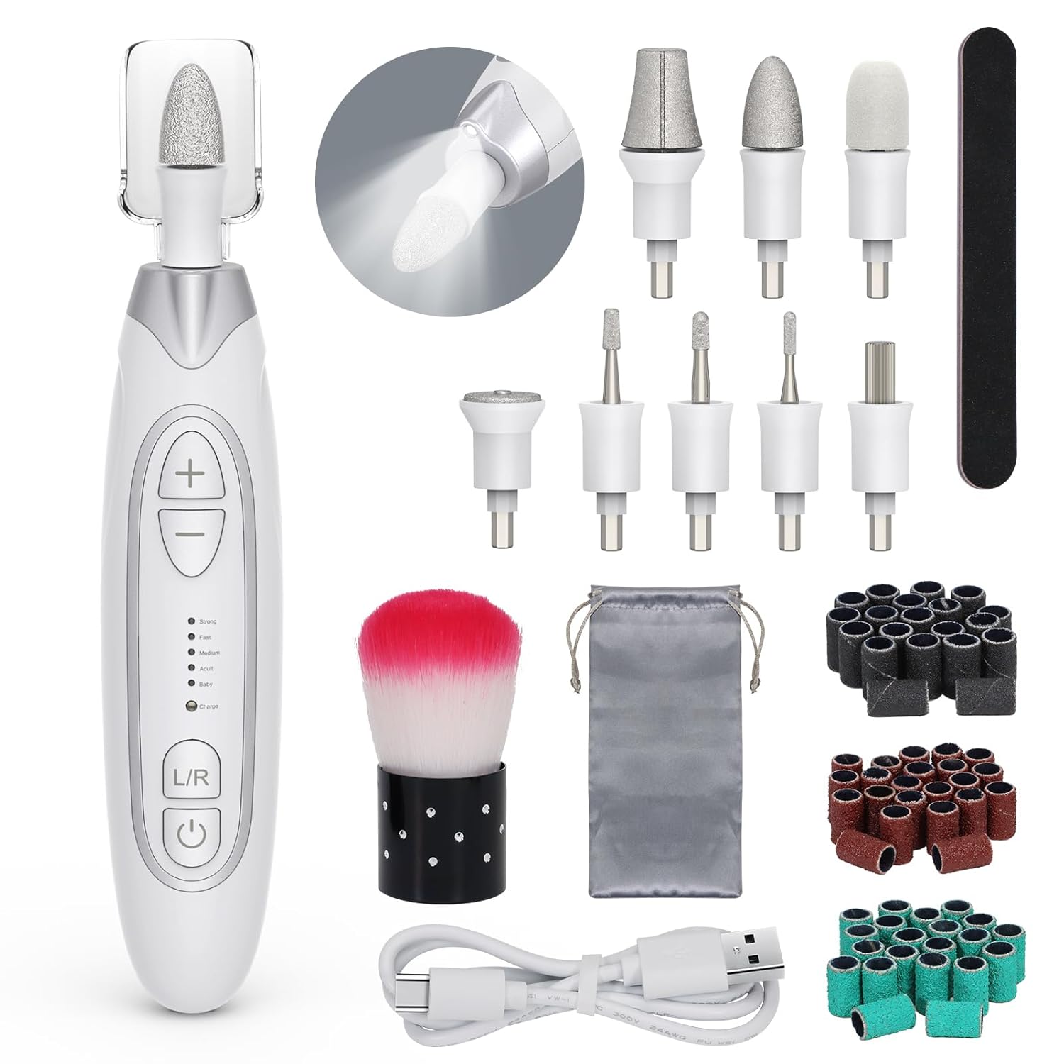 PELCAS Electric Nail File, 5 Speeds Manicure and Pedicure Kit, Cordless Nail Drill, Toenail Grinder for Thick Toenails with LED Light, Dremel Tool Kit for Human, Pet, Toenails, Natural & Acrylic Nails