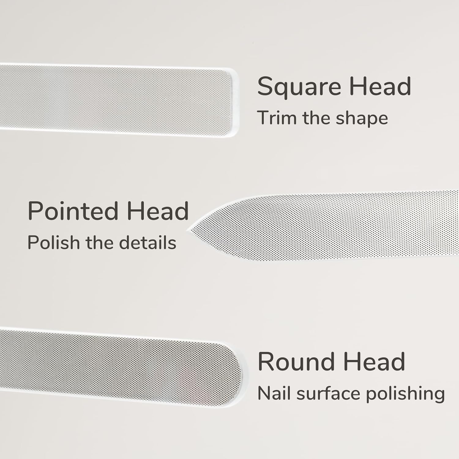 - 3 HEADS, ENDLESS POSSIBILITIES: Shape, polish, and smooth with the square, round, and pointed heads. Our crystal nail files for natural nails create smooth edges and help prevent cracking. Perfect for both home use and travel.